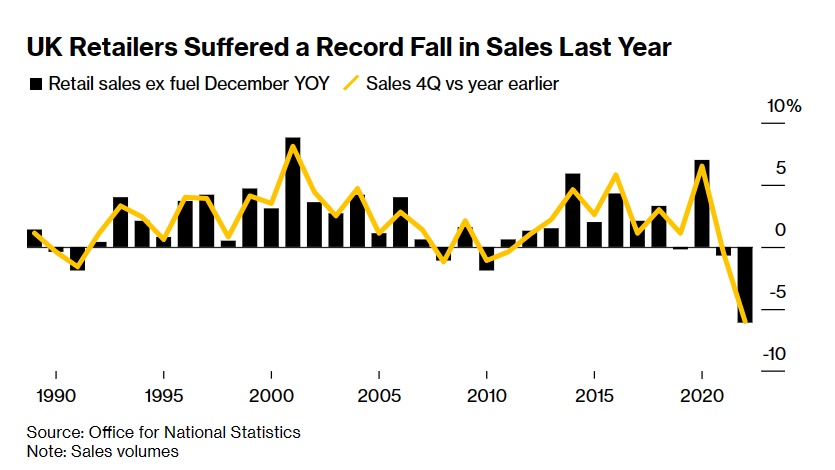 智通财经APP获悉,英国上月零售销售额(整体与核心)意外大幅下滑,为有记录以来最糟糕的零售数据,也为创下40年来最高通胀率的一年画上句号。在去年,生活成本挤压迫使消费者为更少的商品支付更高的价格。英国国家统计局周五公布的数据显示,去年12月英国商店和网上购物规模(整体零售销售额)较上年同期下降5.8%,为1997年有记录以来的最大规模的12月降幅。这一降幅超过了经济学家此前预期的下滑4%。不包括汽车燃油的核心零售销售额也大幅下降6.1%,创下1989年有记录以来的最大降幅。