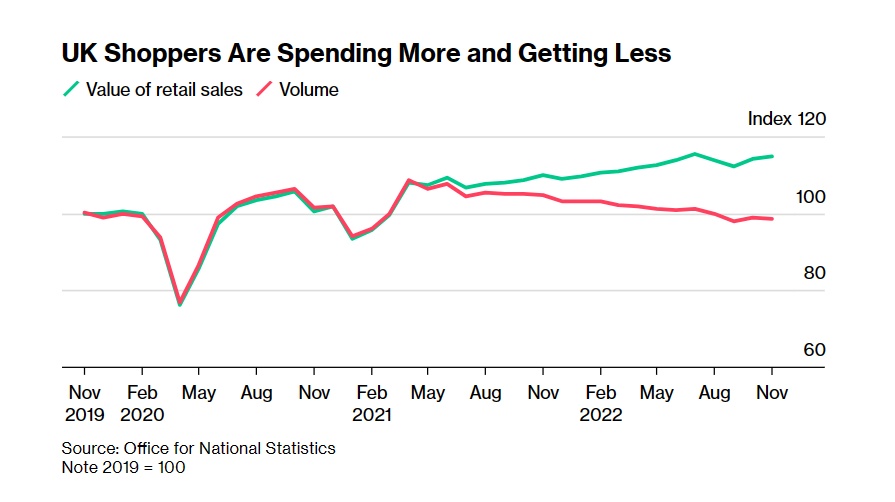 凸显出高通胀正在侵蚀消费者购买力的其中一个迹象是,12月份的销售额较新冠疫情前增长了13.6%,但销量下降了1.7%。这意味着消费者不得不花更多的钱购买更少的东西。