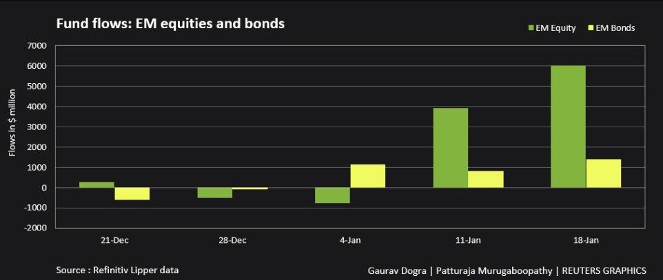 24637只新兴市场基金的数据显示,股票基金增加了60.3亿美元,创下至少自2021年2月以来的最大单周流入。债券基金也获得了14亿美元,连续第三周净买入。