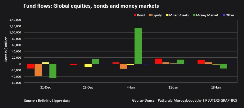 智通财经APP获悉,在截至1月18日的一周内,全球股票基金连续第二周获得资金流入,原因是人们对通胀风险减弱以及美联储加息将更加谨慎的预期,不过,近期数据显示消费者支出有所下降。