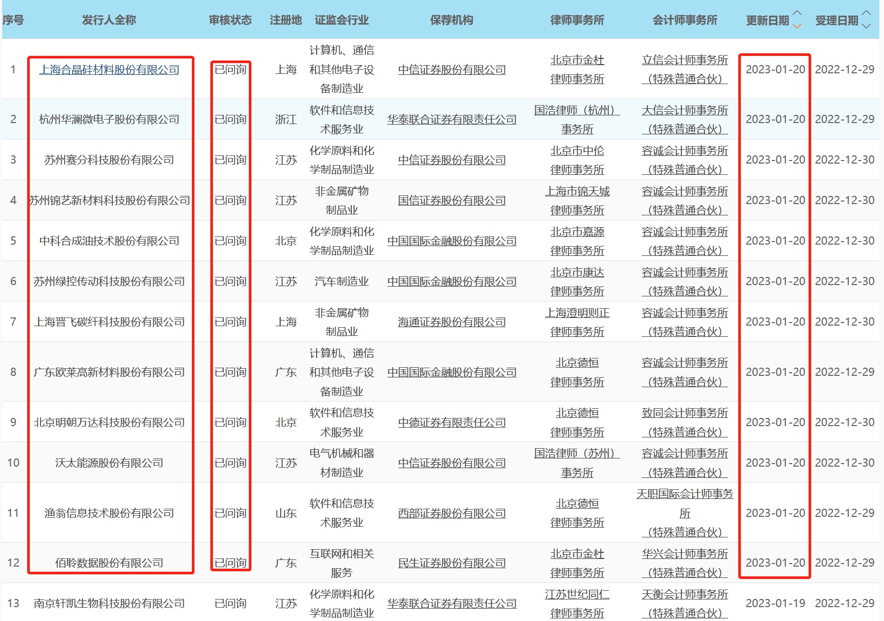 智通财经APP获悉,1月20日,上交所官网显示,上海合晶硅材料股份有限公司、杭州华澜微电子股份有限公司、苏州赛分科技股份有限公司、苏州锦艺新材料科技股份有限公司、中科合成油技术股份有限公司、苏州绿控传动科技股份有限公司、上海晋飞碳纤科技股份有限公司、广东欧莱高新材料股份有限公司、北京明朝万达科技股份有限公司、沃太能源股份有限公司、渔翁信息技术股份有限公司和佰聆数据股份有限公司共12家企业申请科创板IPO审核状态变更为“已问询”。