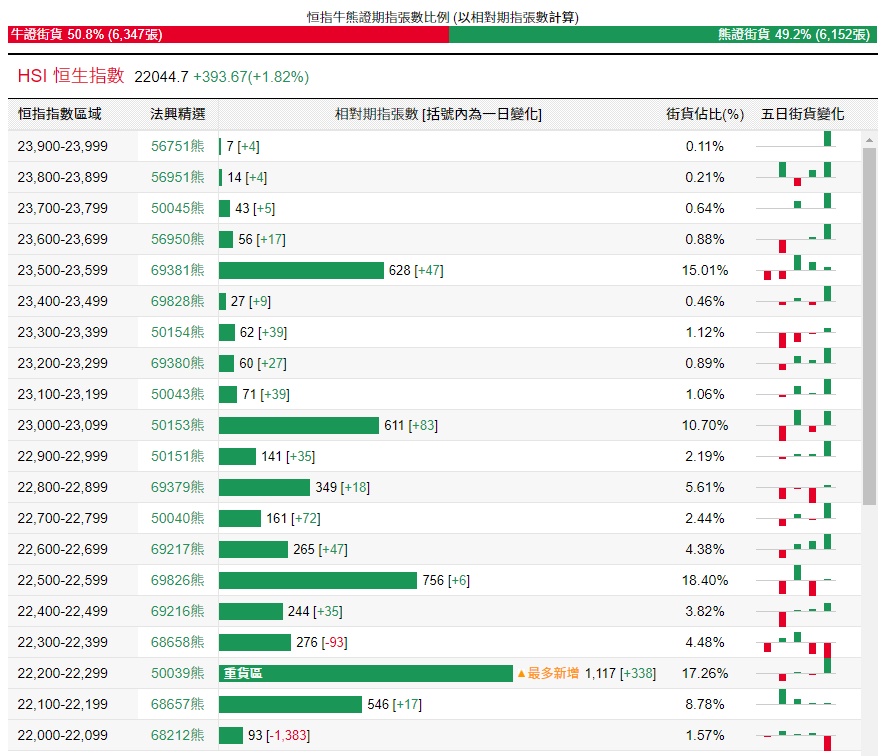 法兴恒指牛熊证街货分布图中的数据显示,熊证街货重货区和最多新增都在22200-22299区间,该区间最新熊证数量为1117张,较上一交易日增加338张。