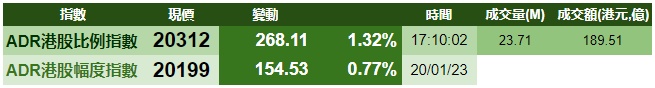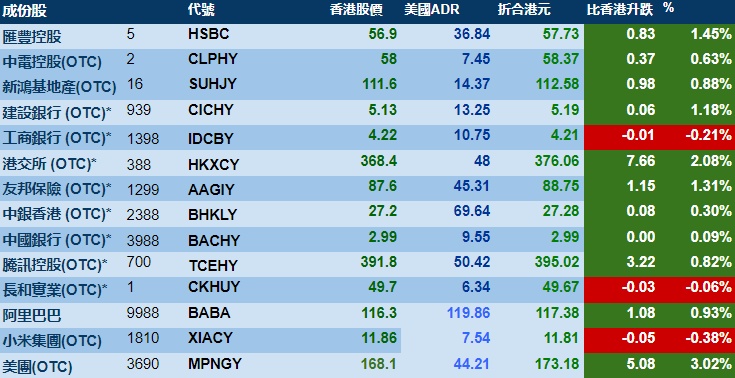 智通财经APP获悉,周五美股三大指数大幅上涨,港股ADR指数上涨,按比例计算,收报20312点,较香港收市涨268.11点或1.32%。