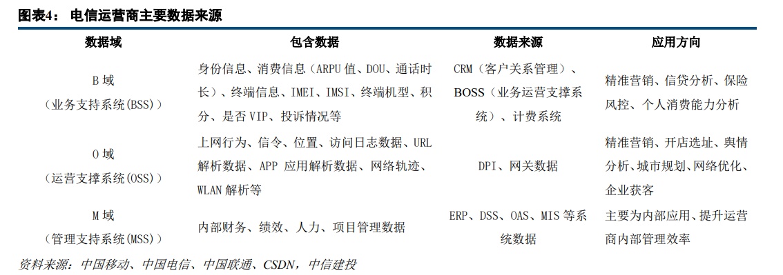 二是运营商大数据系统供应商,运营商内部不同的数据系统及不同数据域之间的数据需要融合(如B域与M域数据融合),推荐关注亚信科技(01675)、东方国信(300166.SZ)、思特奇(300608.SZ)等。此外,DPI与系统供应商也可直接参与运营商的数据变现。