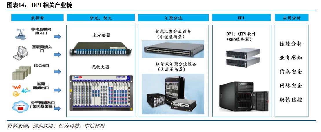 运营商85%的数据来自于O域数据,包含上网行为、信令、位置、访问日志数据、URL解析数据、APP应用解析数据,这些数据的获取离不开DPI(深度报文检测),该行认为随着数据要素市场建设,运营商为了丰富自身数据产品体系,未来DPI设备采购力度或加大,一是需要更多的底层数据,或将采集节点从骨干网延伸至城域网;二是从粗放式识别走向精细化识别,解析对象从文字到图像视频,也将增加后端解析设备的需求。建议关注浩瀚深度、恒为科技等。