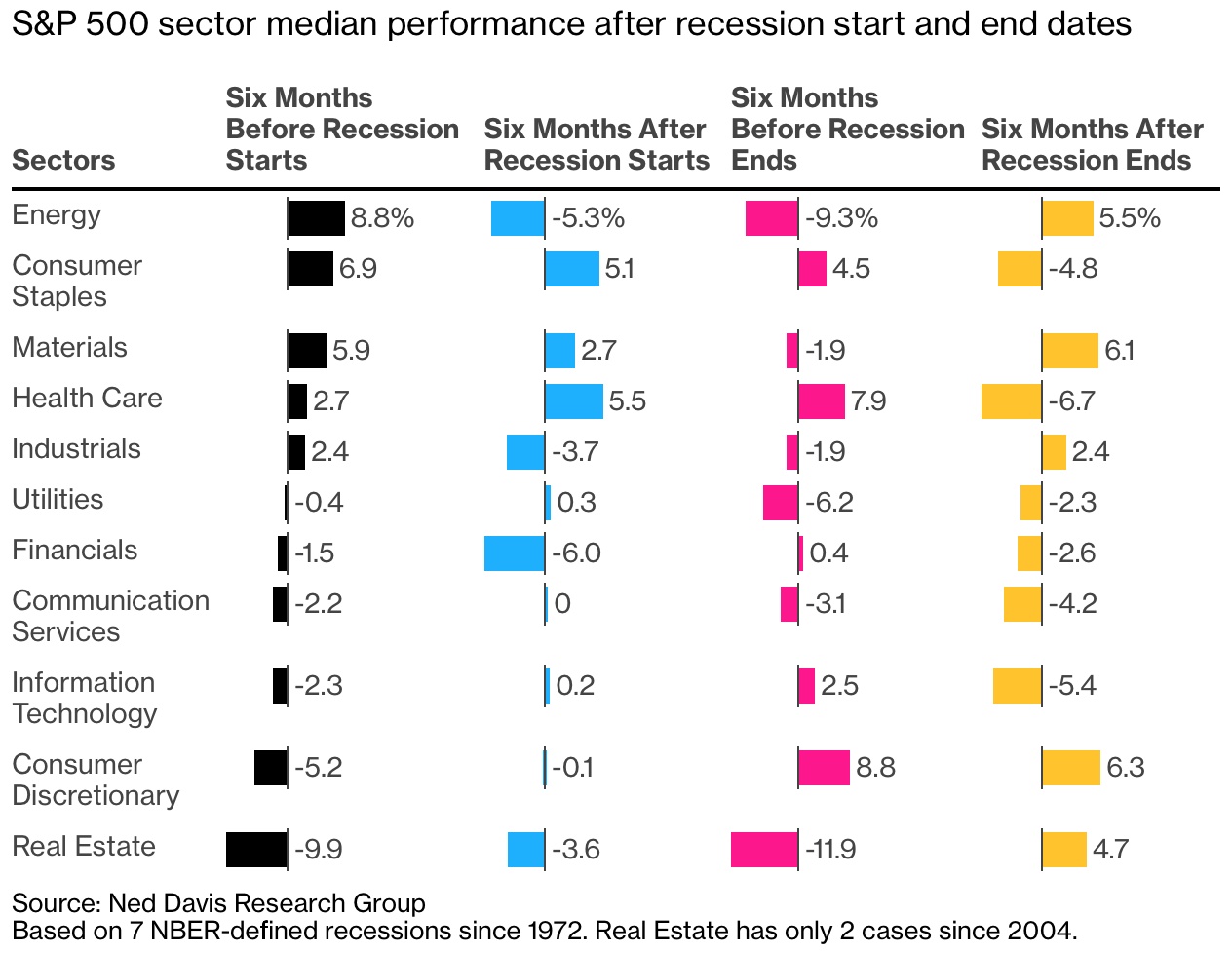 Ed Clissold表示,不同行业历史表现可以为进入低迷时期的投资方向提供指引。那些往往在经济周期后期达到峰值的企业,如材料生产商和工业企业,通常在衰退前的六个月表现强劲。必需消费品和医疗保健类股也是如此。与此同时,金融、房地产和增长型科技等利率敏感行业的股票在此期间的表现往往会落后。