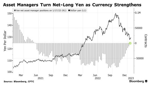 美国商品期货交易委员会(CFTC)的最新数据显示,截至1月17日的一周,资产管理公司的日元净头寸转为正值。这一消息发生在日本央行最近一次政策会议之前。在会议上,日本央行坚持其刺激框架,击退了即将发生变化的押注。