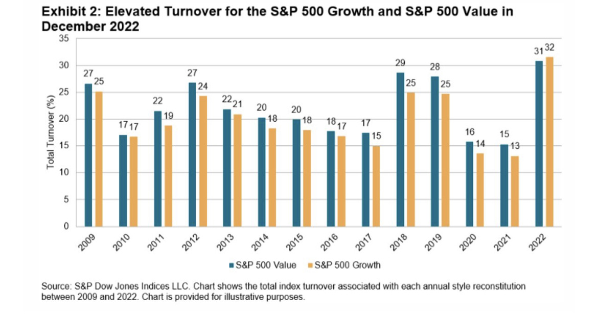 美国股市指数主管Hamish Preston表示,在去年12月的年度调整中,由标准普尔道琼斯指数运营的增长和价值指数出现了创纪录的成交量,近三分之一的市值受到影响。能源股在成长型板块中的占比从1.4%跃升至8%,这得益于股价飙升以及一波收益上调,能源股是去年唯一一个收益为正的行业。在价值型板块方面,科技股的权重上升6个百分点,至16.8%,因该行业成为去年市场上许多最大输家的所在地,分析师下调了他们的预期。