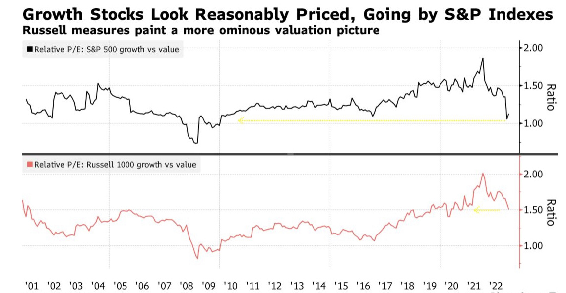 对于希望衡量价值股复苏能持续多久的投资者来说,这是一幅混乱的图景。根据标准普尔指数,增长股相对于价值股的估值处于第40百分位——看起来合理。而根据罗素指数,这一比例位于第82百分位——仍然很昂贵。据花旗策略师Scott Chronert称,这两个指标之间的差距是20年来最大的。