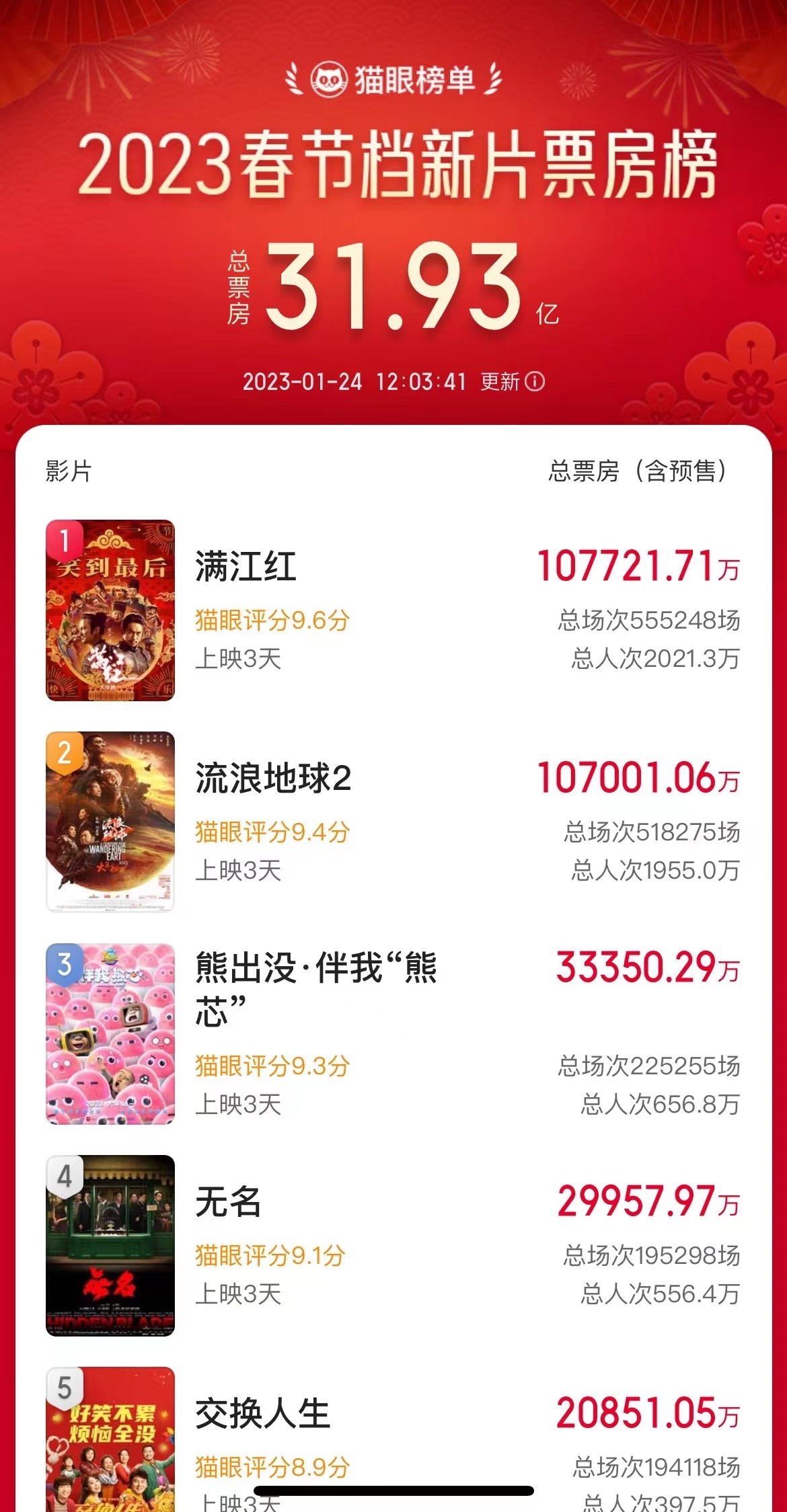 智通财经APP获悉,春节影市开门红,今年“春节档”,七部大片集中上映,电影市场热闹非凡。据猫眼专业版数据显示,截止发稿,2023年中国电影市场累计票房超36.40亿(折合美元5.36亿美元),超北美票房成绩,暂列全球单一市场票房冠军。其中,2023年春节档新片预售总票房达31.93亿元,电影《流浪地球2》、《满江红》、《熊出没》分别位列票房榜前三名,含预售票房分别为10.77亿元、10.70亿元、3.34亿元。2023年大年初二单日票房破10亿,春节档连续2日单日票房突破10亿元。