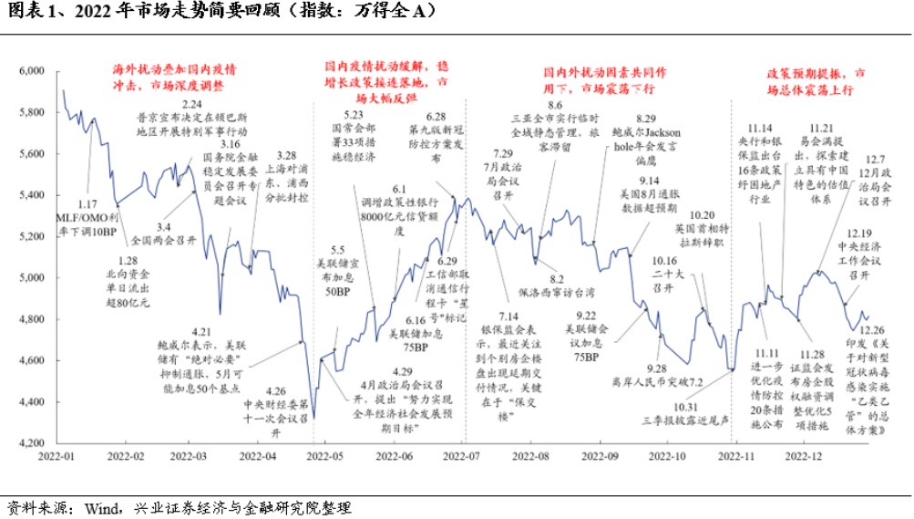 2022年,市场连续遭遇海外美联储大幅加息、俄乌冲突,国内疫情反复扰动、地产信用风险等“黑天鹅”冲击。“内忧外患”之下,A股显著回调。2月底开始国内多地爆发大规模疫情,叠加海外俄乌冲突爆发、美联储开启新一轮加息周期,导致市场深度调整。至4月底,国内疫情扰动缓解,复工复产陆续推进,稳增长政策接连落地,A股迎来大幅反弹。然而7月开始,国内多地房企断供事件发酵、社融结构恶化,叠加极端高温天气下限电限产影响,经济再次遭受扰动。另外,出口增速回落、海外流动性冲击下人民币汇率遭受贬值压力,国内外扰动因素共同作用下,A股震荡下行。直至11月,地产融资“三支箭”加速落地、防疫政策加速优化,叠加美联储预期加息节奏放缓,A股开始震荡上行。2022全年,万得全A下跌18.66%,期间最大回撤幅度达28.21%。