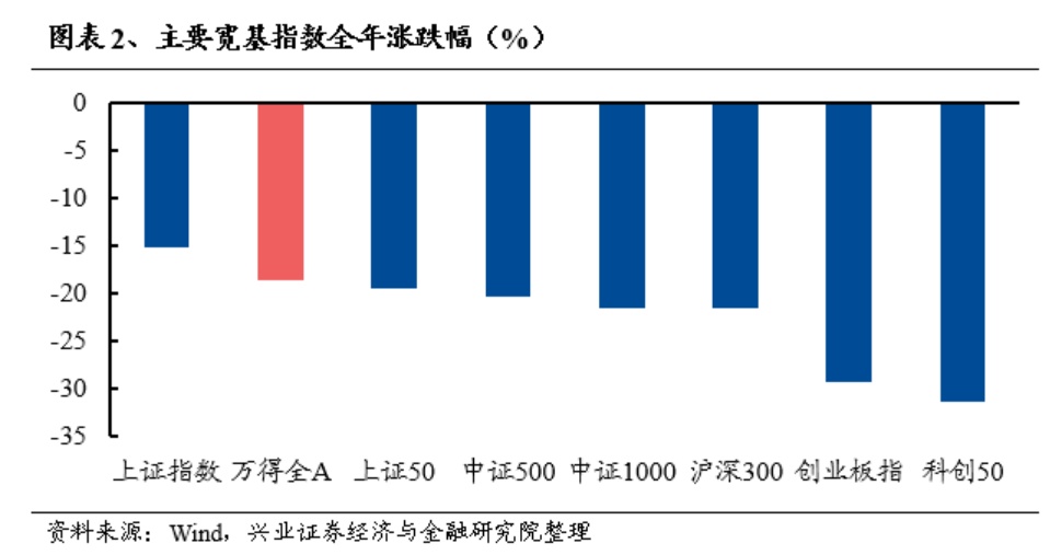 主要宽基指数层面,科创50、创业板指、沪深300、中证1000、中证500、上证50、上证指数分别下跌31.35%、29.37%、21.63%、21.58%、20.31%、19.52%和