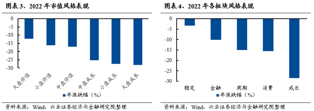 风格层面,全年价值跑赢成长,大盘好于小盘。板块风格上,稳定、金融、周期和消费板块分别下跌3.25%、10.09%、14.99%和15.56%,成长板块明显承压,下跌28.47%。