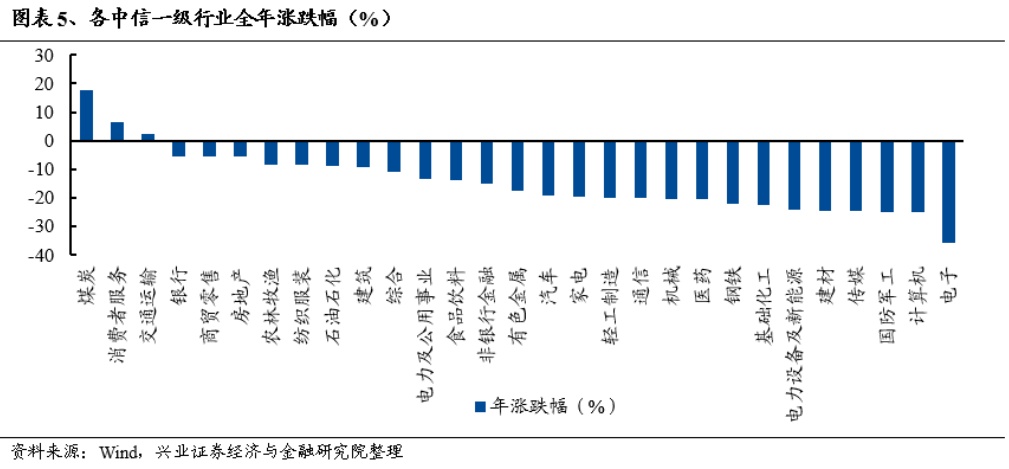 行业层面,全年仅煤炭(17.52%)、消费者服务(6.39%)和交通运输(2.31%)三个行业上涨,其余行业均下跌,其中电子(-35.75%)、计算机(-25.14%)、国防军工(-24.85%)、传媒(-24.55%)和建材(-24.38%)领跌。