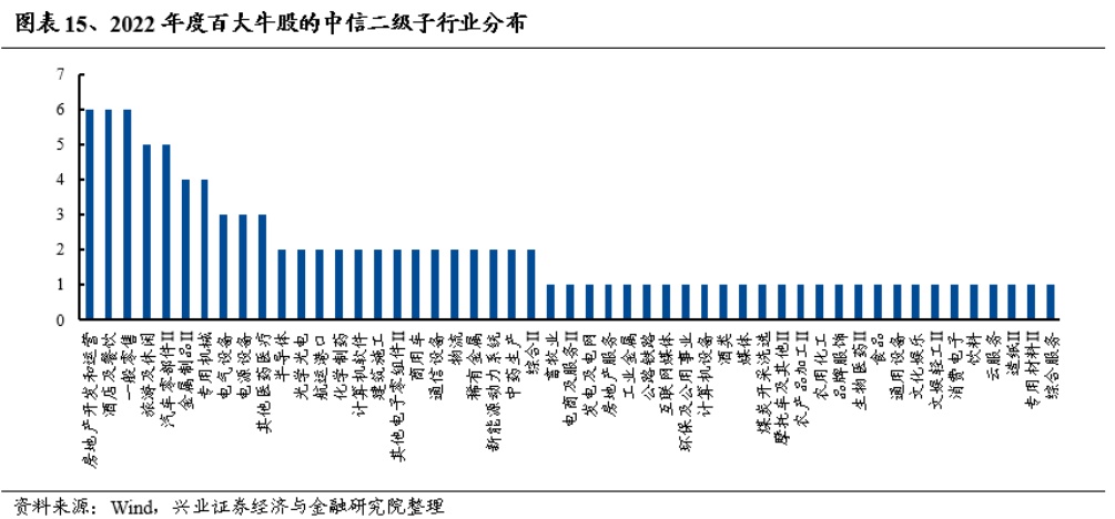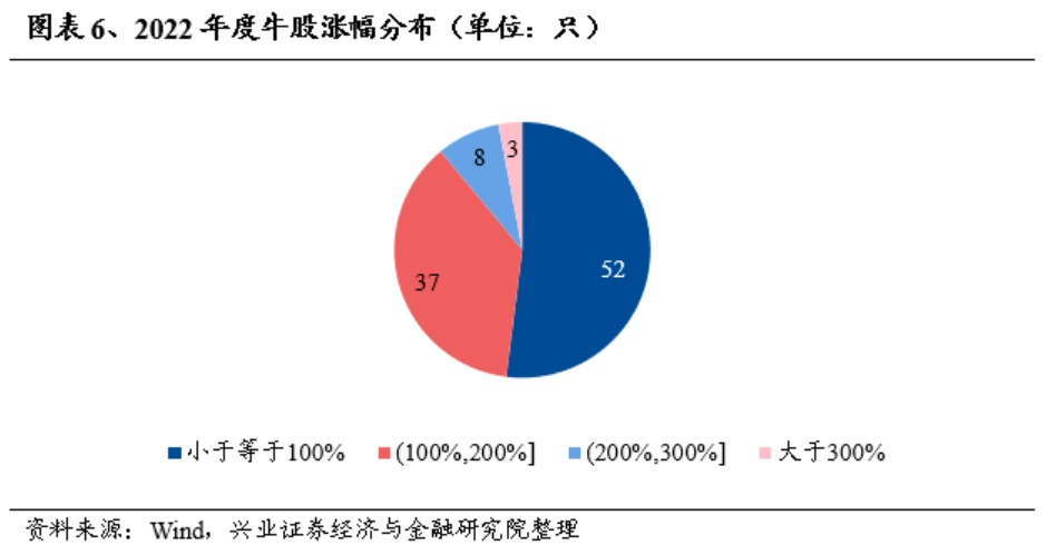 从细分行业来看,在所有出现牛股的二级行业中,数量排名前四的行业均来自于消费板块,包括房地产开发和运营、酒店及餐饮、一般零售和旅游及休闲。1)消费者服务:酒店及餐饮、旅游及休闲行业分别贡献了6%和5%的牛股。行业内牛股均明显受益于5月全国疫情边际好转及11月以来防疫政策放松两次疫情利好消息,居民出行意愿回暖、线下消费场景复苏增强了市场对板块业绩企稳回升的预期。2)房地产:房地产开发和运营板块出现了6%的牛股。3月国务院金融稳定发展委员会会议提出“及时研究和提出有效的防范化解房地产风险应对方案”、8月“稳地产”和“保交楼”等地产政策持续推出,以及11月融资“三箭齐发”,均明显提振市场信心,房企估值修复带动股价上行。3)医药:9月底以来医药板块政策边际宽松缓解市场担忧情绪,11月防疫政策优化后需求量大幅提升,继续带动板块上涨。4)商贸零售:随着各类促消费政策持续推出,叠加防疫政策优化后消费场景复苏,11月以来市场情绪回暖催化助力板块牛股诞生。