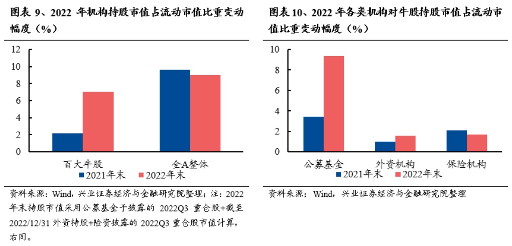2022年,机构整体逆市加配牛股。我们选取了2021Q4及2022Q3公募基金重仓股、截至2021/12/31及2022/12/31外资(陆股通)全部持股、2021Q4及2022Q3保险公司重仓股,并分别计算行业内个股整体持仓市值占其流动市值比重。整体来看,由于2022年市场大幅回调、风险偏好收敛,机构普遍缩减了权益资产头寸。而与之相对的,基金和外资对牛股的整体配置比例却均有提升,险资尽管减配但幅度也小于A股整体。