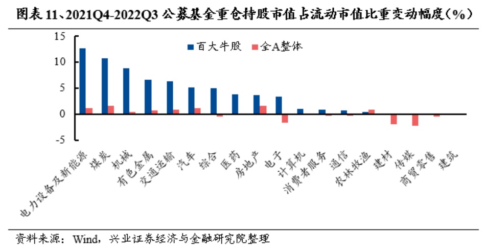 具体来看,公募基金显著增配电力设备及新能源等行业的牛股。公募基金前三季度减配A股,持仓市值占流通市值比重由2021Q4的5.48%下降到2022Q3的5.38%;但公募基金持仓占百大牛股流通市值的比重由2021Q4的3.41%上升至2022Q3的9.36%。行业层面,2022年前三季度公募基金主要增配电力设备及新能源、煤炭和机械等行业牛股(其中煤炭仅山煤国际一只,存在一定偶然性)。