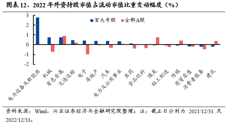 外资对牛股增配方向与公募基金类似。2022年全年外资流入放缓,持仓占全部A股的比重由4.09%下降至3.80%。与之相对,外资对百大牛股的配置比例则由0.97%上升至1.59%。行业层面,外资对牛股主要增配方向与公募基金类似,电力设备及新能源、机械、有色金属行业增配比例位居前三;与公募基金的主要区别在于减配了消费者服务、商贸零售和传媒板块。