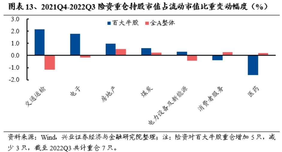 保险公司主要增配交通运输行业牛股。2021年末至2022Q3期间,险资持仓占牛股流通市值的比重反而从2.07%下降至1.67%。行业层面,险资主要增配交通运输、电子和房地产行业牛股,持仓占比分别提升2.15%、1.80%和0.97%;与此同时,险资整体减配医药和消费者服务行业牛股,持仓占比下降-1.62%和-0.38%。