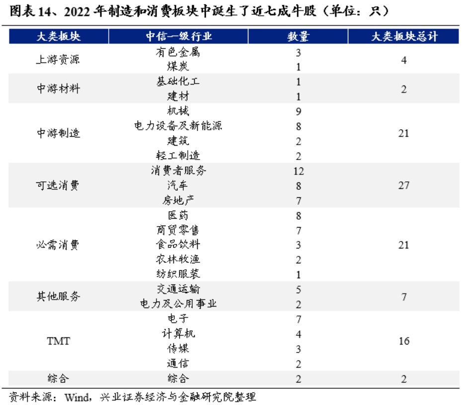 从大类板块来看,可选消费、中游制造和必需消费板块诞生的牛股数量最多。我们将中信一级行业重新划分为上游资源品、中游材料、中游制造、可选消费、必需消费、其他服务业、TMT、金融和综合九大板块,并统计分布于各大类板块的牛股数量,可以发现,可选消费、中游制造和必需消费板块诞生的牛股数量最多,分别贡献了数量占比达27%、21%和21%的牛股,合计占比近七成。