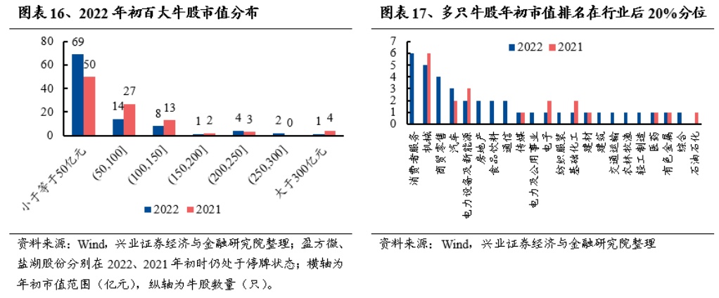 我们进一步从行业分布、市值分布、ROE水平和归母净利润增速水平来刻画百大牛股的特征,并得到以下结论:1)2022年牛股核心线索:底部反转的消费+景气延续的高新制造;2)市场流动性趋紧,存量资金博弈下小盘股受益,相较2021年,更多小市值个股跻身牛股;3)相较于ROE,市场更偏好g,牛股归母净利润增速较全A整体的领先幅度更为明显。