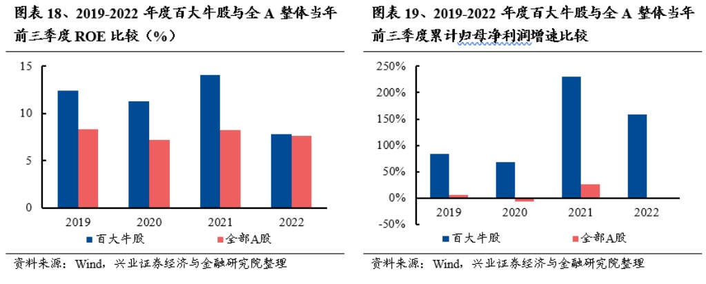 牛股归母净利润增速较全A整体的领先幅度更为明显。我们以2022年前三季度ROE代表企业盈利能力,以前三季度累计归母净利润增速代表企业业绩增速,并采用整体法计算牛股及全部A股整体水平。具体来看,百大牛股整体前三季度ROE为7.78%,仅仅略高于全A整体的7.74%;而百大牛股整体2022年前三季度累计归母净利润增速为157.99%,远高于全A整体的1.38%。与2019-2021年相比,2022年度百大牛股相对全部A股整体ROE领先幅度明显收窄,而业绩增速g仍然保持较大幅度领先。总体上,2022年百大牛股相对全部A股的表现说明了市场对于高业绩增速个股的偏好进一步提高。