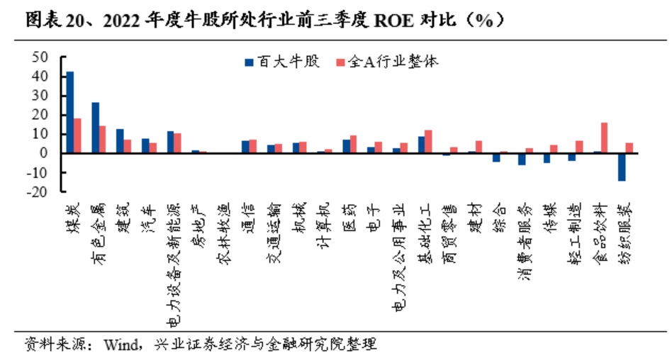 行业水平层面,百大牛股所在的23个中信一级行业中,有6个行业的ROE高于对应行业全部A股整体,多数来自中上游周期和制造板块,其中煤炭、有色金属、建筑领先幅度靠前,分别超过对应行业24.04%、12.24%和5.69%。相反,在牛股数量占绝对多数的消费板块,包括纺织服装等传统消费行业,以及传媒和轻工制造等带有一定消费性质的行业,牛股ROE低于对应行业整体水平,主要受益于疫情改善或防疫政策边际优化下,市场对于其未来的修复预期。