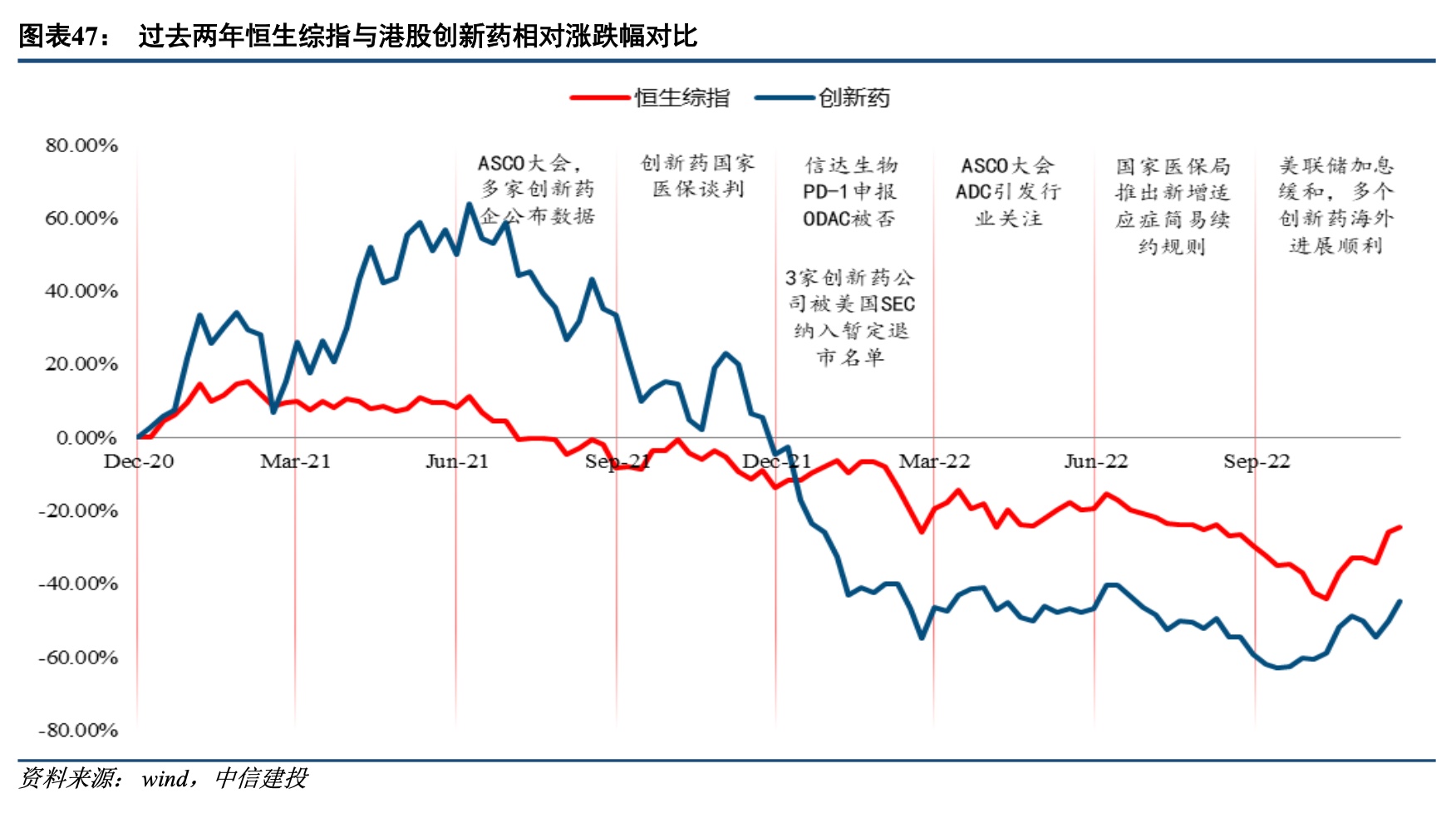 多重压制因素缓解,创新药产业迎来春天2023年创新药的行业环境有望逐步触底回升。21年7月以来,创新药显著跑输恒生综指。主要原因我们认为有以下几点:1)美联储加息导致全球风险资产估值下行,以DCF估值为基础的创新药资产敏感性更高;2)创新药定价不及预期,导致销售不及预期,进而影响峰值销售预测;3)行业内部竞争激烈,企业盈利困难,经营压力较大;4)创新药出海遇到阶段性困难。而以上问题在22H2逐步缓解,加息预期反应相对充分,医保谈判更加科学化市场化,伴随行业出清竞争减少,出海迎来新的曙光。因此展望2023年,我们对行业环境进一步改善保持乐观。