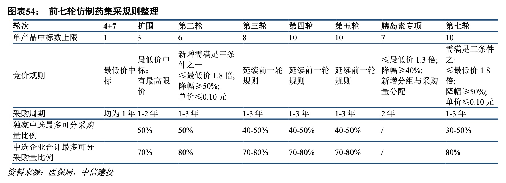 集采常态化,降幅趋于稳定。国家组织药品集中带量采购已进行七批,频率逐渐稳定在一年两轮。经过多轮探索,集采规则不断优化,引导企业合理布局,目前规则已趋于常态化、稳定化。集采中标企业数逐步增多,平均降幅趋于稳定。