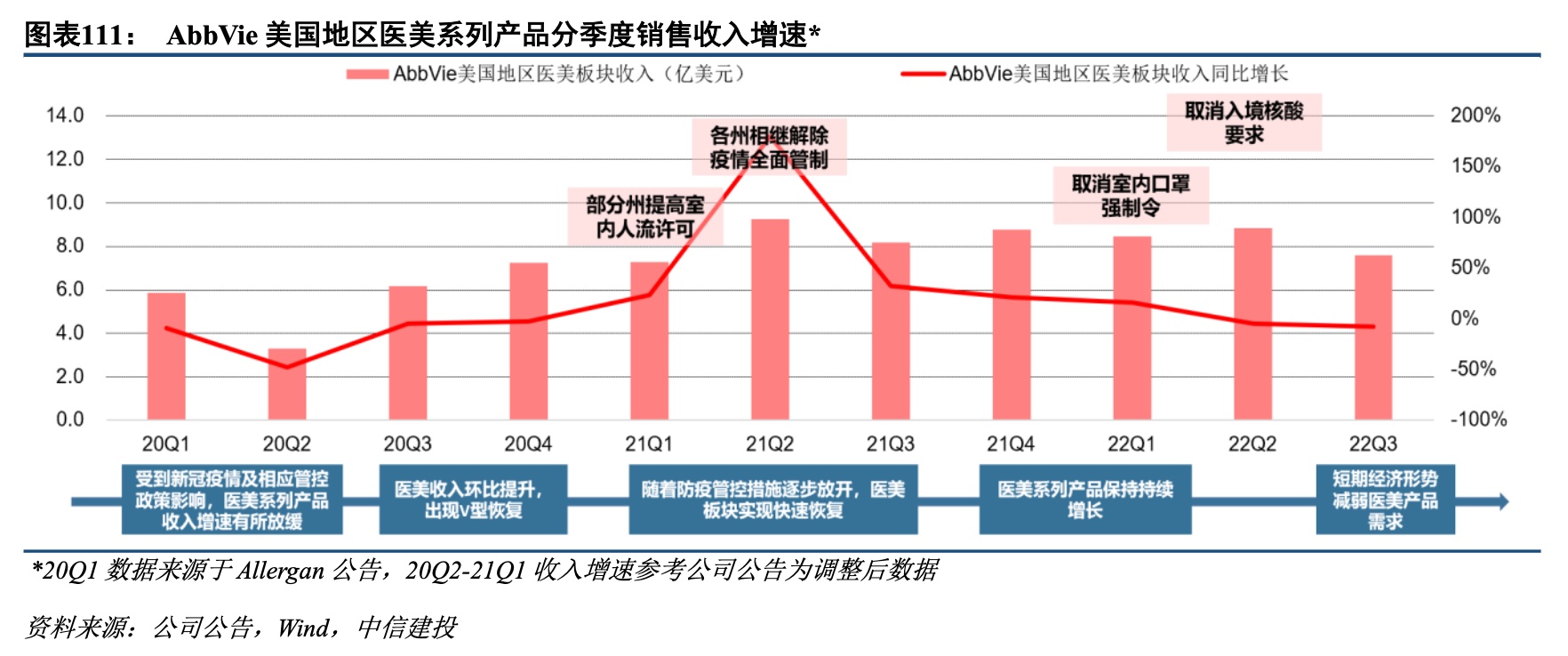 海外疫情管控政策调整,疫后医美需求逐步复苏。艾尔建(Allergan)作为全球医美生物制药领域的领导企业,旗下美学产品组合覆盖面部美学、身体塑性、整形、皮肤护理等领域,多年来通过外延+内生,已经逐步成长为全球医美龙头。2020年,艾伯维(AbbVie)宣布以630亿美元收购艾尔建,公司正式更名为艾尔建美学(Allergan Aesthetics)。根据艾伯维财报数据,20年疫情爆发初期,受到新冠疫情及防疫政策影响,美国地区医美板块收入大幅下滑,但随着美国疫情管控政策逐步放松,可以看到公司医美板块收入环比持续提升,21年在低基数下实现快速增长,疫后医美需求逐步复苏。