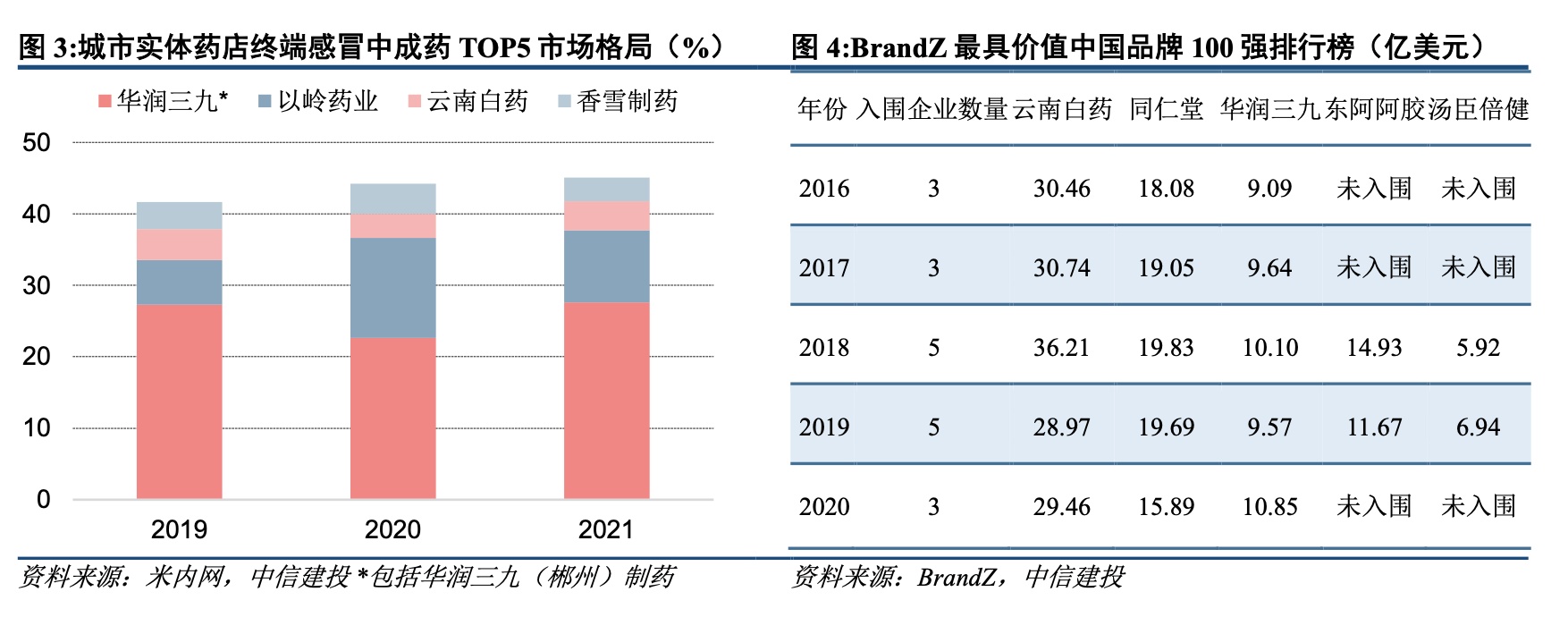 中药消费品:看好品牌延展、渠道扩张、定价能力强的龙头企业。品牌延展、渠道扩张、定价能力强的品牌中药企业将逐渐步入高质量发展阶段。2020年以来,疫情催化线上B2C、O2O渠道的高速扩张,为我国OTC市场提供了新的增长点,而不断出台的中医药利好政策,也给中药消费品市场带来增量发展空间,随着产业政策及格局变迁,品牌OTC历久弥新,有望逐渐步入高质量发展阶段。在中药消费品市场品牌企业集中度的进一步提升的大背景下,我们认为,品牌延展、渠道扩张、定价能力强的品牌中药企业将逐渐步入高质量发展阶段。在目前政策环境下,我们认为中药OTC公司有不同程度的价值重估机会,建议重点关注华润三九、同仁堂、太极集团等辨识度较高的品牌中药公司。