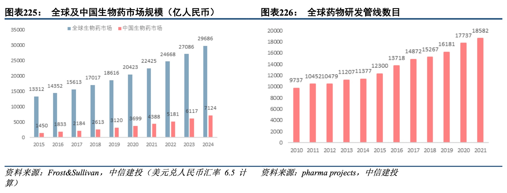 生物药:生物药是重组蛋白试剂十分重要的下游领域。根据Frost&Sullivan,2019年全球生物药市场规模为2864亿美元(18616亿元人民币),2024年有望达到4567亿美元(29686亿元人民币),年复合增长率为9.8%。在原研药制剂专利到期、医疗需求增长、监管体系更趋完善等有利因素的共同作用下,全球生物药市场的年复合增长率明显高于同期医药市场的平均水平。2019年中国生物药市场规模达到480亿美元(3120亿元人民币)。得益于医保支付能力的提高及患者自费承担能力的增强,预计2024年中国生物药物市场将进一步增长至1096亿美元(7124亿元人民币),年复合增长率为18.0%。