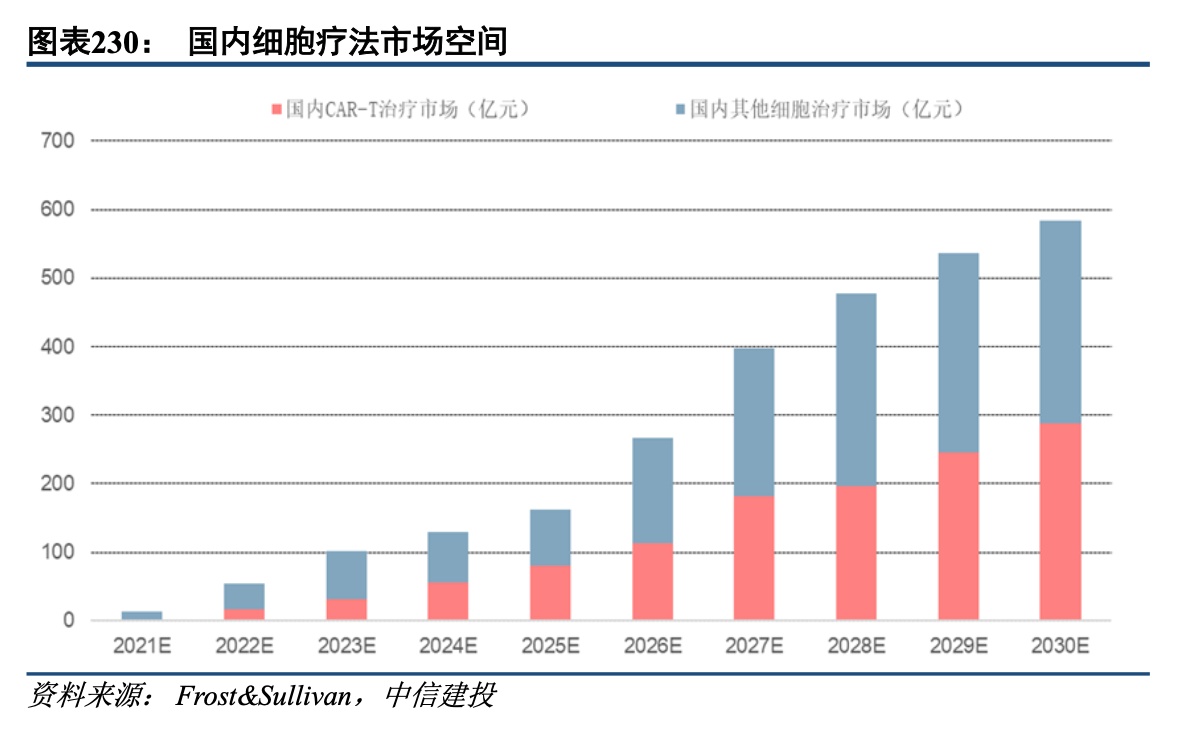 细胞与基因治疗:持续高景气的细分领域赛道,商业化爆发在即。据弗罗斯特沙利文预计,我国细胞治疗市场空间将由2021年的13亿元增长至2030年的584亿元,年均增速高达53%。其中CART细胞疗法市场空间将由2021年的2-3亿元增长至2030年的287亿元;其他细胞治疗市场空间将由2021年的10亿元增长至2030年的297亿元。