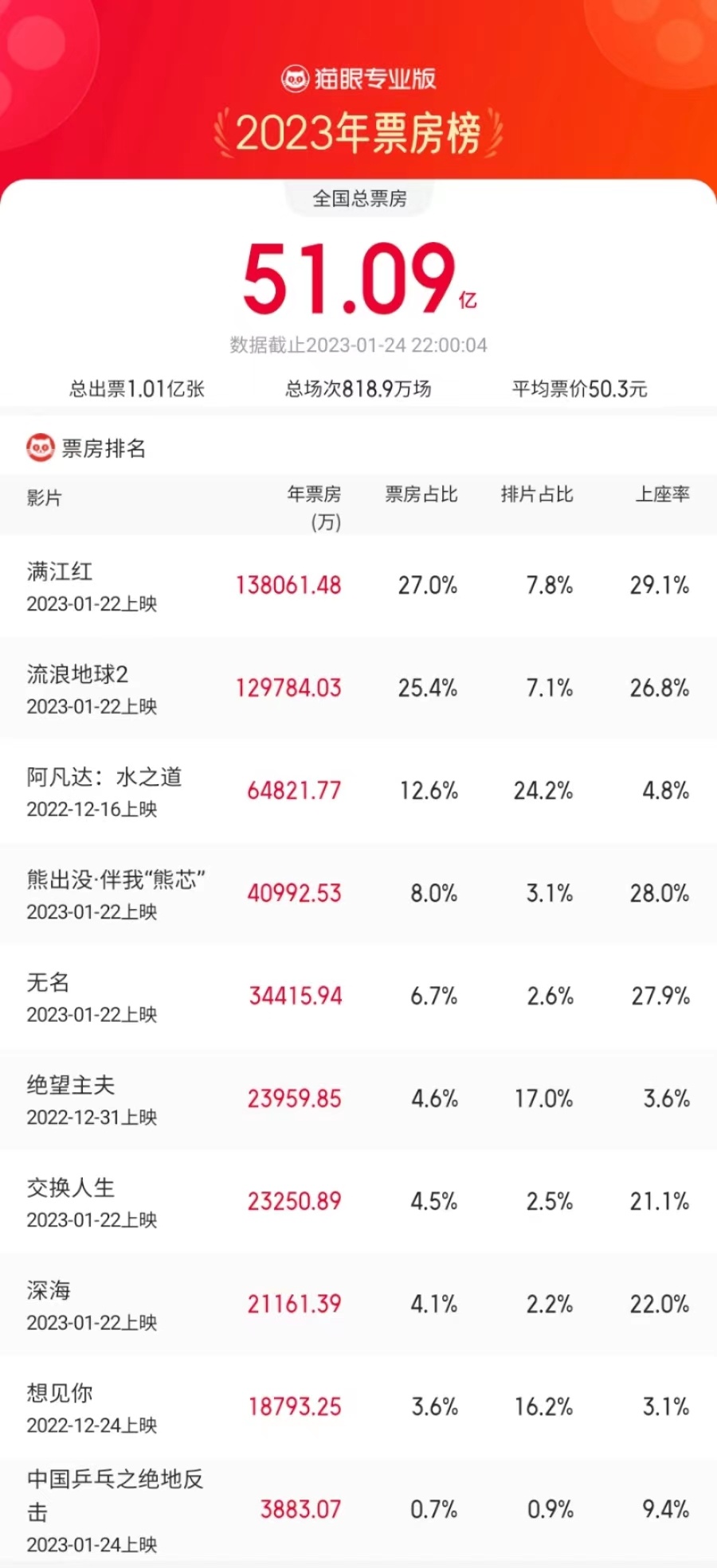智通财经APP获悉,猫眼专业版数据见证,截止2023年1月24日20时,2023年度大盘票房(含预售)破50亿!截至发稿,2023年大盘票房(含预售)为51.09亿元,其中《满江红》票房超越此前一直领跑的《流浪地球2》,暂列春节档票房榜第一位。