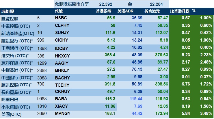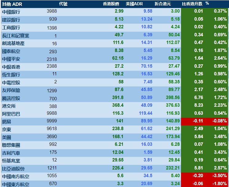 智通财经APP获悉,周二美股三大指数涨跌不一,港股ADR指数上涨,按比例计算,收报22392点,较香港收市涨347.63点或1.55%。
