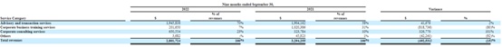 业务结构方面,2022年前三季度,该公司企业业务培训、企业咨询以及咨询和交易服务分别占公司业务的约7%、23%和70%。