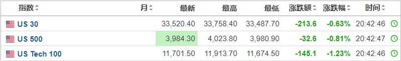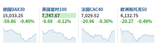 2. 截至发稿,德国DAX指数跌0.40%,英国富时100指数跌0.12%,法国CAC40指数跌0.30%,欧洲斯托克50指数跌0.49%。