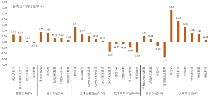 美国12月CPI同比增速的回落,缓解了市场对通胀的担忧,对后续流动性收紧的预期减弱。节前一周,受经济基本面数据的综合影响,美元指数微跌-0.17%,行至101.9966的近期低位。全球权益类市场中的大中华区、美洲市场、欧非中东市场、亚太市场,主要权益指数的走势开始出现分化;在风格上则是以科技、成长占优,价值类板块表现较弱。纳斯达克指数周涨幅为1.01%,而道琼斯工业指数跌幅为-2.70%。欧洲三大指数,德国DAX、法国CAC40和英国富时100涨幅分别为-0.35%、-0.39%和-0.94%。