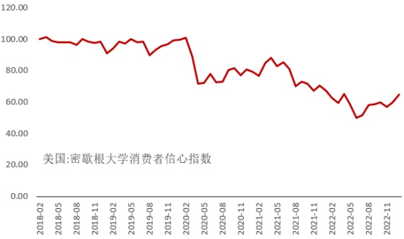 美国密歇根大学消费者信心指数2023年1月的数据为64.60,较2022年12月份的59.70有显著的提升。该指数的反弹,与重要节假日有很大的关系,去年12月份耐用新消费依然是承受了很大的压力。劳动力市场方面,工资压力偏高,导致美国通胀回落的时间和力度均仍难以预料,但市场表现看,明显偏向于乐观。