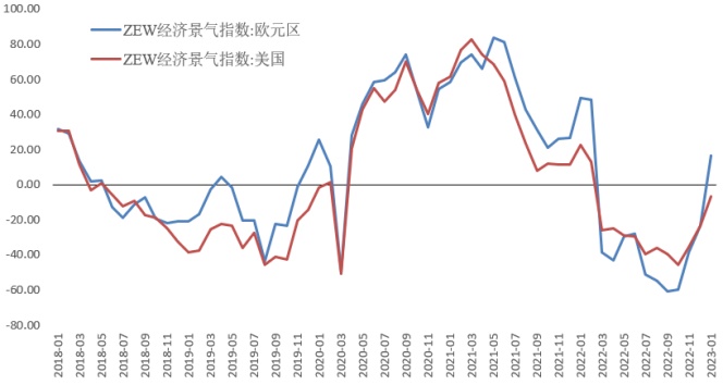 在经济景气度方面,2023年1月份欧元区和美国的ZEW经济景气指数均有显著的回升。欧元区由2022年12月份的-23.60提升至16.70,而美国相应的由-23.60升至-6.70。