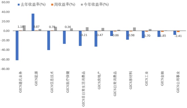从GICS(全球行业分类系统)划分的一级行业指数来看,美股市场在过去的一周里,在通讯、能源和信息技术等行业表现较好,分别有1.18%、0.87%和0.78%的涨幅的周涨幅。而公用事业、金融、工业等为代表的行业跌幅居前,分别有-2.41%、-1.85%和-1.70%的跌幅。