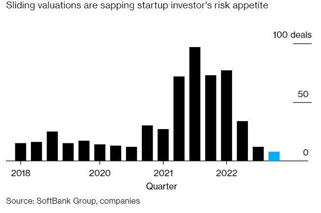 智通财经APP获悉,随着市场估值持续下滑,软银(SFTBY.US)去年第四季度对初创公司的投资金额创下历史新低,令创业寒冬愈加艰难。软银曾在一个季度内参与了90多家初创公司的投资,金额达到300亿美元。然而,软银第四季度仅参与了8笔投资,金额为21亿美元。这是自愿景基金推出以来,软银的投资数量首次降至个位数。