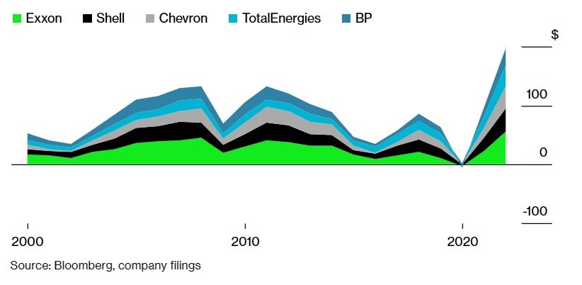 根据机构汇编的分析数据,这五家油气巨头预计将在未来几天报告2022年的年度利润总额达到1987亿美元,比十多年前创下的年度纪录高出50%。