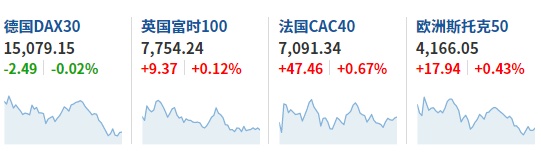 2. 截至发稿,德国DAX指数跌0.02%,英国富时100指数涨0.12%,法国CAC40指数涨0.67%,欧洲斯托克50指数涨0.43%。