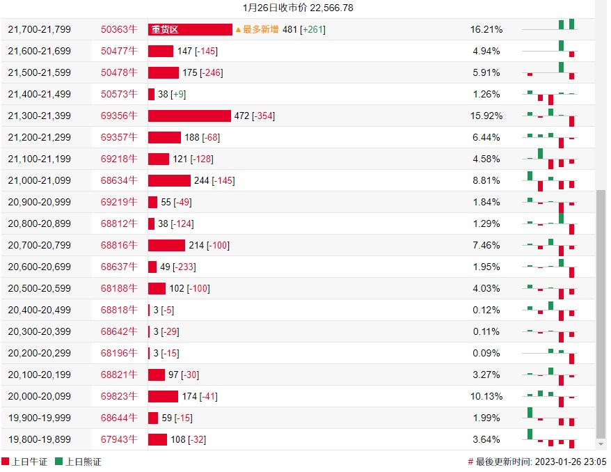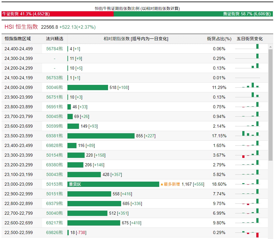 法兴恒指牛熊证街货分布图中的数据显示,熊证街货重货区和最多新增都在23000-23099区间,该区间最新熊证数量为1167张,较上一交易日增加556张。
