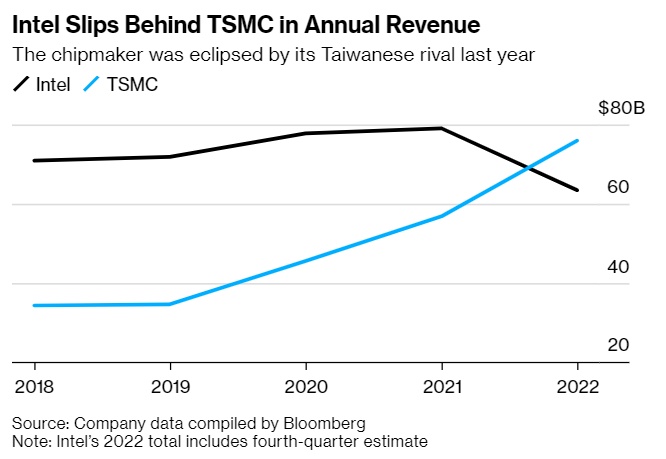 严峻的业绩表明,英特尔进一步落后于竞争对手。英特尔2022年的总营收已低于台积电(TSM.US),台积电是一家芯片制造商,为英特尔的许多竞争对手提供芯片,并使部分客户能够设计自己的组件。此外,曾经占据市场主导地位的英特尔在销量上已经落后于三星电子。