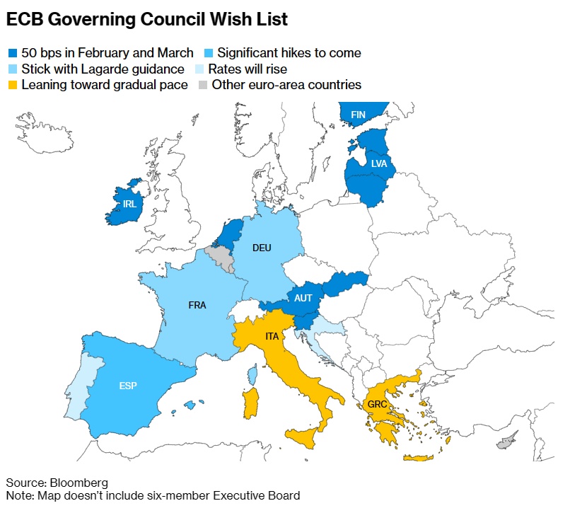 欧洲央行定于下周公布更多细节,其中可能包括利率峰值指引,以及可能计划从3月份开始缩减其庞大规模的资产负债表,在过去十年更是购买了高达5万亿欧元的债券。这一过程将从官员允许部分债务到期开始,而不是像现在这样将债券收益进行再投资。