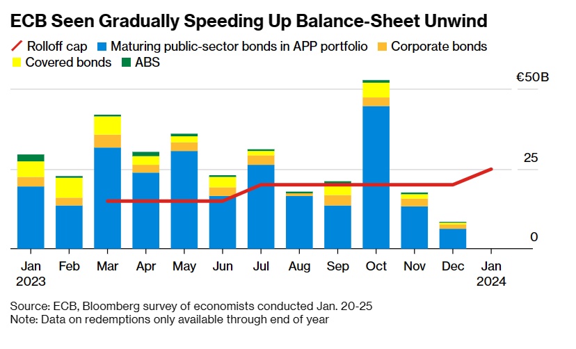 经济学家预测,最初的缩表上限——设定在6月份之前每月缩减150亿欧元债券投资组合,后续将在第三季度增加50亿欧元规模,并在年底前后再次增加,直到2024年稳定在250亿欧元。欧洲央行也有可能在未来的某个时候直接出售债券。