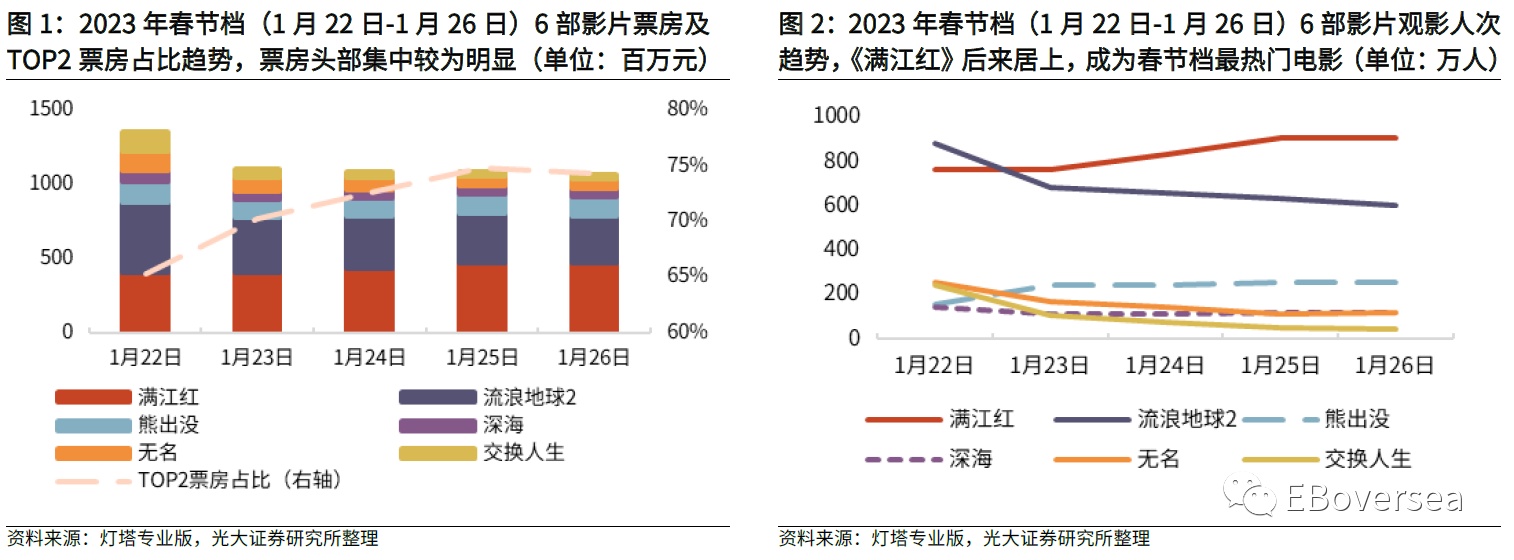头部影片票房集中明显,口碑重要性依旧凸显。1)单片看,《满江红》反超《流浪地球2》,5日累计综合票房分别为21.9、18.7亿元,TOP2电影票房占春节档总票房的71.2%;2)截至23年1月26日,《满江红》、《流浪地球2》豆瓣、灯塔、猫眼三平台平均评分分别为8.9和9.1,其余影片综合评分较高,保持高质量和高口碑。