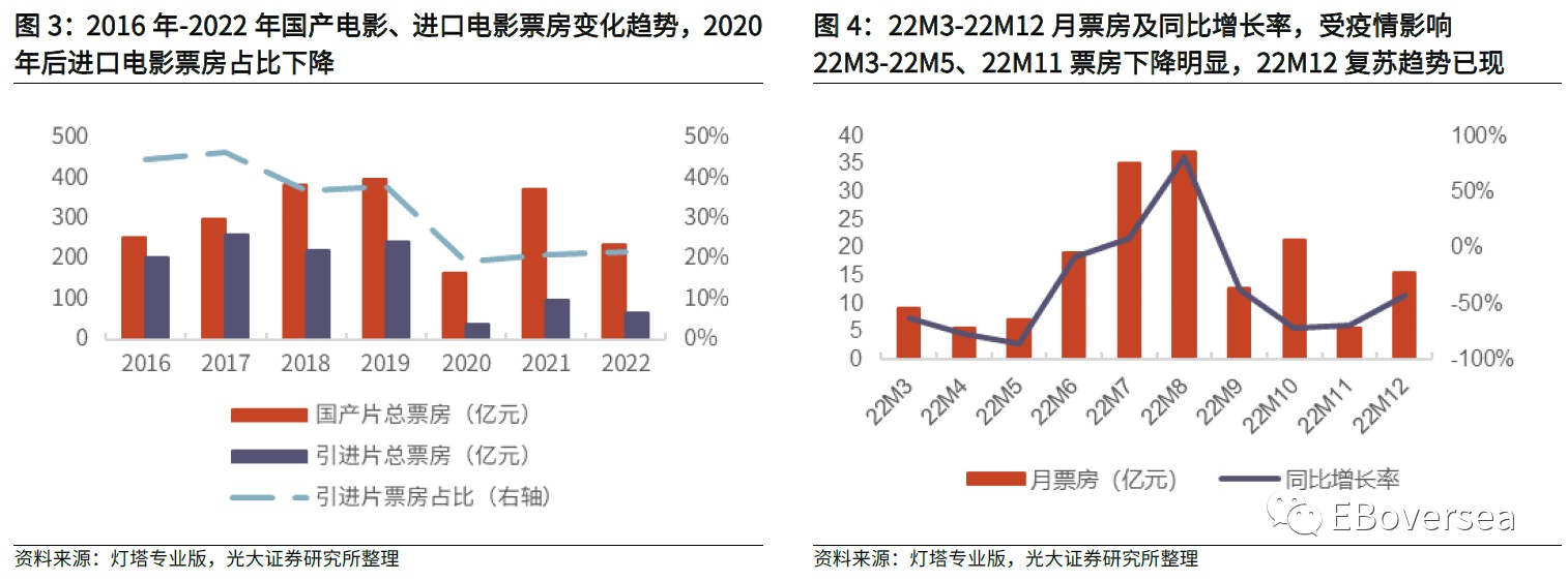 2)需求端:疫情管控放松后线下消费复苏,票房回升长期趋势不改。受疫情反复影响,22M10、22M11全国电影票房分别同比下降71.7%、69.7%;22M12疫情管控放松后月票房同比降幅缩小至42.3%,为春节档票房回升奠定基础。随着各地疫情趋于稳定、线下消费进一步修复,电影消费增长潜力将逐步释放。